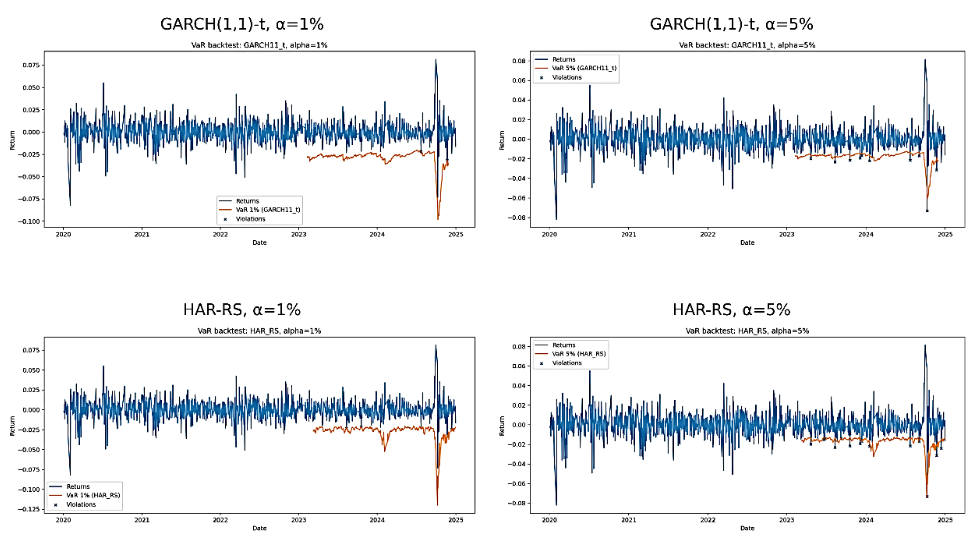 From a risk management perspective, the VaR backtesting results displayed in Figure 5 reveal that both conditional variance models can deliver good risk coverage in normal times, but the exceedances are quite clustered during extreme market stress periods (e.g., second half of 2024), which means that the tail risks are significantly underestimated by both models. Among them, the HAR-RS model shows an excessive number of violations at the 1% confidence level, reflecting a more pronounced issue of insufficient coverage, whereas the GARCH(1,1)-t model performs relatively more robustly but still demonstrates systematic bias under extreme volatility. Overall, the findings suggest that single-model approaches face inherent limitations in capturing extreme risk, implying that future research could explore ensemble modeling techniques or fat-tailed distributional adjustments.