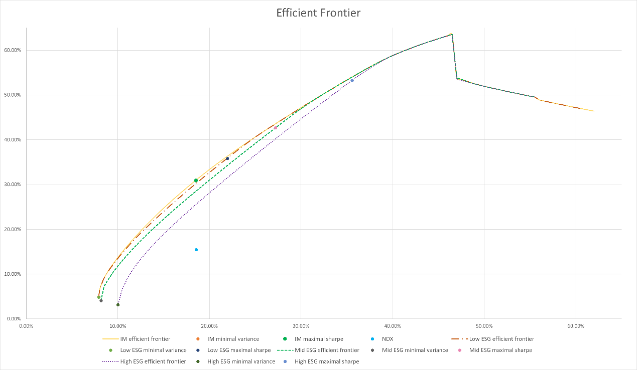 As people’s awareness of the importance of sustainability grows, ESG investing becomes an integral part of investment management and generates appreciable returns. In order to study the performance of ESG portfolio, this article picks 81 companies from MSCI ESG USA Leaders Index that listed on NASDAQ to form the stock universe based on the data from 2015 to 2025. ESG scores data are also included to indicate and control the ESG level. Portfolios at different ESG levels are established using Generalized Reduced Gradient Method as the optimizer. Taking the optimal portfolio derived from Index Model and NASDAQ-100 Index as benchmarks helps intuitively understanding the benefit and defect of ESG investing. The research runs static analysis over the whole time horizon and dynamic analysis in each year. The empirical result shows that ESG portfolios have absolute advantages over the market index and not too bad performance compared to the optimal portfolio. It is also found that ESG investing may have some effect on uncertainty removal and return smoothing, which does not monotonically change with the ESG level. The research offers supportive reason why investors should incorporate ESG factors in investment.