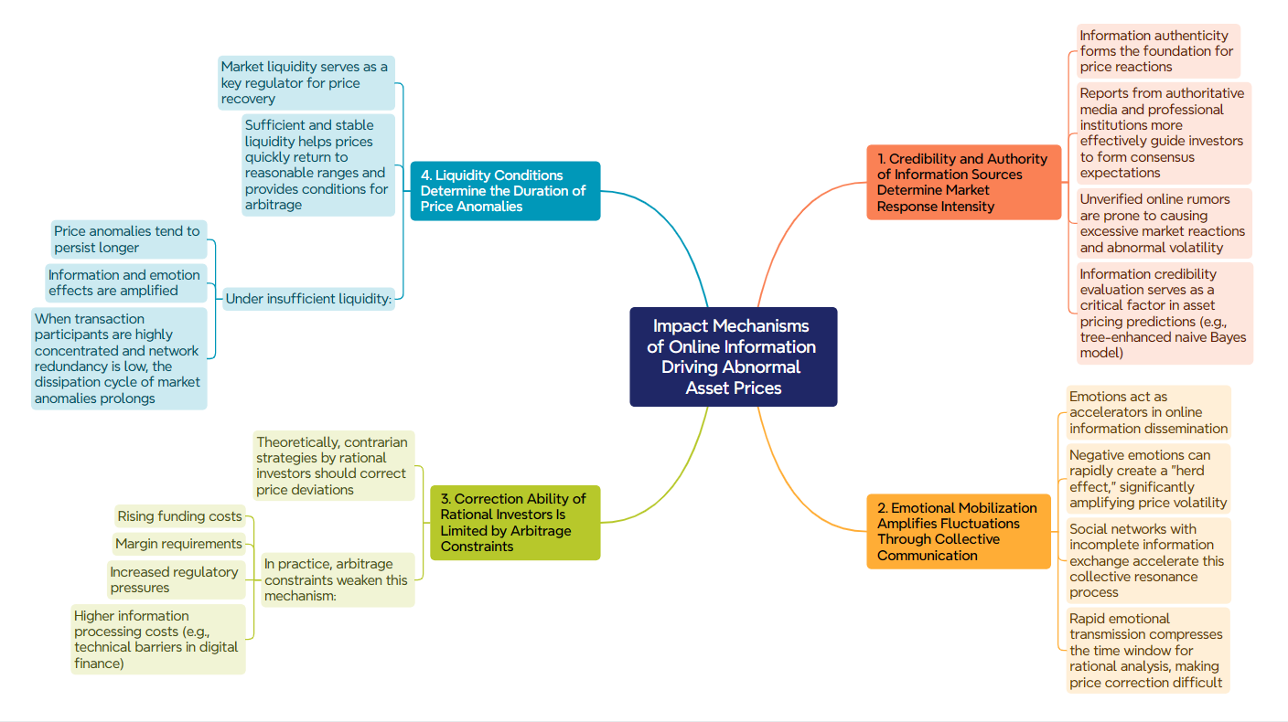 Under the background of the deep integration of the digital economy and capital markets, based on this article focuses on a very urgent phenomenon is the Internet Information caused by abnormal asset prices, in order to clarify the inherent effect of the Internet Information caused by abnormal asset price: through combining a mix of domestic and overseas studies by means of a mixed method and thorough investigation by mixing thorough investigation and case study by a mixture of case study and quantitative methods. First, the credibility and authority of the source of online information is the initial point from which we can assess how intensely and in which direction market participants will react to the information; Second, the emotional tendencies in the information get blown out of proportion through the collective spreading of information across all social media platforms; It will further exacerbate the volatility of assets; And Third Some practical restraints such as transaction costs and short-selling prohibitions reduce how much rational actors can take advantage of arbitrage opportunities and make it difficult for price distortions to be corrected promptly; The degree of market liquidity determines the duration of abnormal prices. These 4 act mutually supportive to disrupt the balance among intrinsic value of assets and current market transaction price. This research work will provide more specific theoretical guidance and references for various investors who make more rational investment choices.