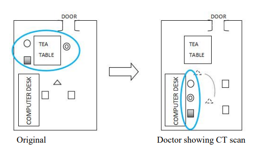 After Mike introduced his father’s medical history and condition, he said, "I don't know the results of this CT scan," hoping to gain a more specific understanding of the condition. The doctor responded, "I think it's necessary to show you his CT scan," and led Mike and his mother to the computer desk. The spacial layout therefore changed(Fig. 2).