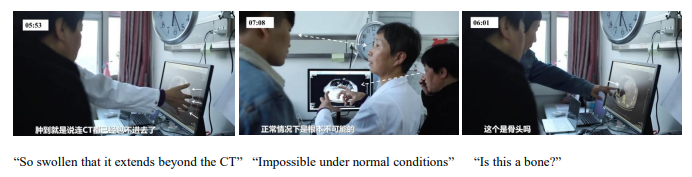 For specific images, the doctor used various gestures and verbal expressions to explain the condition. Some gestures were indexical, pointing out areas with pleural effusion to explain intestinal gas; some are metaphorical, using five fingers to scoop inward to indicate the intestine was so swollen that it looked like a "large water balloon" or "large water sac" (Fig. 3 left). Finally, the doctor used eye contact to communicate with Mike (center), expecting his understanding.