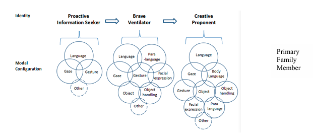 The patient’s son Mike was an proactive information seeker when he was informed about his father’s condition. While listening, he used simple, language prevalent modal configurations. He was a brave ventilator when expressing emotions and wills, employing complex body language and frozen action as well as language. At the decision making stage, his identity was that of a creative proponent; he tapped on varied modalities to express his idea. As a family member he demonstrated his agency in medical decision making to fulfil the patient’s wish, and the increase of modalities throughout the meeting process seemed to coincide with the enhancement of his agency.