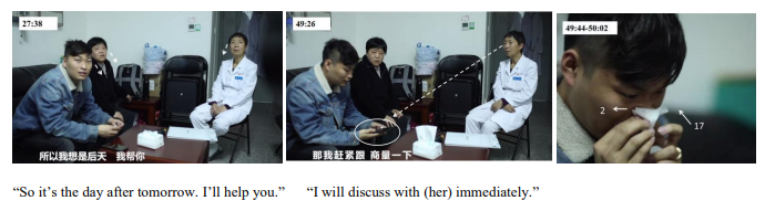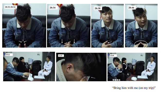 Mike’s modal configuration was quite complex. His pauses for thought increased (Episode 4), and his gaze shifted between the off-camera social workers (Fig. 7 left), the doctor, upward, and downward at the phone (center), accompanied by significant head turns and nodding. This indicated an increase in his external interaction partners and the need for more internal thinking time. Taking tissues to sniffle repeatedly (right) might mean emotion management. On the other hand, his determined facial expression with pursing lips might reflect resolve. The decision was turning into action, as seen in the subsequent object handling of calling the bride.