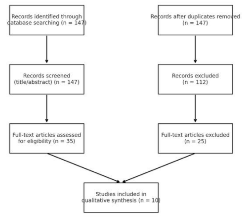 This systematic review followed PRISMA (Preferred Reporting Items for Systematic Reviews and Meta-Analyses) guidelines to ensure transparency and reproducibility. Literature searches were conducted in July 2025 across four databases: PubMed, Web of Science, Scopus, and PsycINFO, covering studies published between January 2019 and July 2025. This time frame was selected to capture recent research developments following increased attention to adolescent mental health and urban environmental interventions, especially in the context of post-COVID-19 recovery. The following combination of keywords was applied: (adolescent OR teenager OR youth) AND (green space OR urban green OR park OR natural environment) AND (depression OR depressive symptoms OR mental health). After removing duplicates, a total of 147 articles were identified. These underwent a two-phase screening process: title/abstract review followed by full-text assessment. Ultimately, 10 studies met the eligibility criteria and were included in the final analysis. As shown in Figure 1, the PRISMA flow diagram illustrates the literature selection process, including the number of studies identified, screened, assessed for eligibility, and ultimately included in the systematic review.