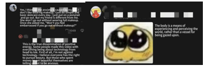 The comments all come from the Chinese social media platform, Douyin (Figure 2). From the hashtag of refute female traditional aesthetic canon, there are thousands of posts, the comments of the posts are significant, and it can reveal that the reaction of the public to the hashtag movement. In the first image, the commentator believes that the females’ anxieties come from themselves; in other words, people watch the video posted by the “beautiful lady”. The “beautiful lady” represents the females who have become more attractive through plastic surgery, and inside the video, the “beautiful lady” expresses their thoughts of not having anxiety, which causes the public or females to create dissatisfaction with themselves, because the bloggers who express these ideas are too perfect and beautiful. The comment on the right side of Figure 2 expresses that the body is for feeling and experiencing the world, not for the carrier of gaze. The commentator believes that females should not always feel anxious and seek to have an overly thin or skinny body, the body can grow up to different sizes it wants, not be restricted in the frame of aesthetic canon.