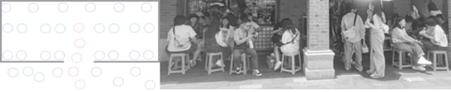 In studying the northern section of the space, there is a clear phenomenon of the aggregation and differentiation of the consumption behaviors of the two main subjects. After communicating with the majority of shop owners on this road, it was found that nearly 80% of them said, "We mainly serve tourists/students." It can be seen that most shops have already considered their product positioning and set corresponding scenes to attract crowds when they are in business. In the middle section of the research space, the passenger flow increases, and tourists and students gather in a shop. It can be found that tourists usually consume in several shops, staying for a short time at each shop. In contrast, students usually only choose one shop to finish and last for a long or short time. Therefore, the dine-in area inside the shop is generally occupied by students, while tourists gather on the roadside to wait for their food and take it away. The different consumer groups of the shops naturally form boundaries between them. At the same time, the other consumption behaviors of the two main subjects also lead to the formation of boundaries between the roadside waiting area and the dine-in area inside the shop.