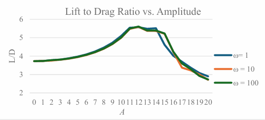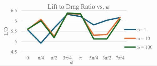 Moreover, in these simulations, the lift to drag ratios are only calculated within one period. To make the results more reliable, one can repeat the simulation with more periods. Also, the time intervals used in the simulation is 0.05/ω, which means that each simulation will generate only 125 data points. To get a more precise result, the time intervals can be further decreased to 0.01/ω, or less.