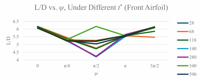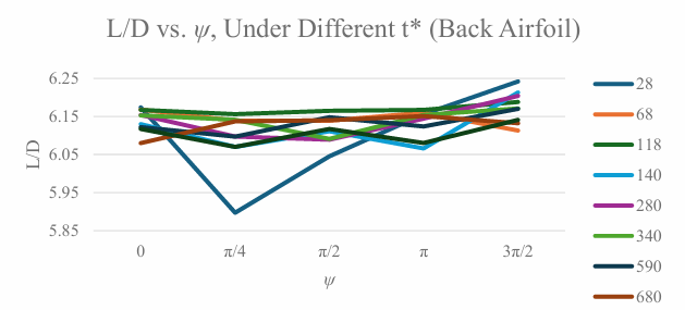 Comparing the data recorded in Table 4 and Table 5, most of the L/D values are larger in the rear airfoil than the front airfoil. An unusual observation is that at t*=34000, the L/D of the front airfoil is maximized at ψ = π/2, which is 6.173, while the maximum L/D of the back airfoil is 6.171. However, Figure 6 shows that all t* values other than 34000 will result in the L/D to be minimized near ψ = π/2. Hence, this deviation is most probably caused by anomalous spikes in the simulation results, due to the time steps or mesh grid taken.