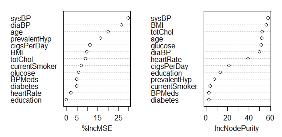Table 2 shows the importance indicators of the variables in the RF model, including %IncMSE (percentage increase in mean square error) and IncNodePurity (increase in node purity). The greater the value of both, the more important the feature is to the model. Table 2 shows that sys BP, diaBP, and age have a significant impact on the incidence of CHD.