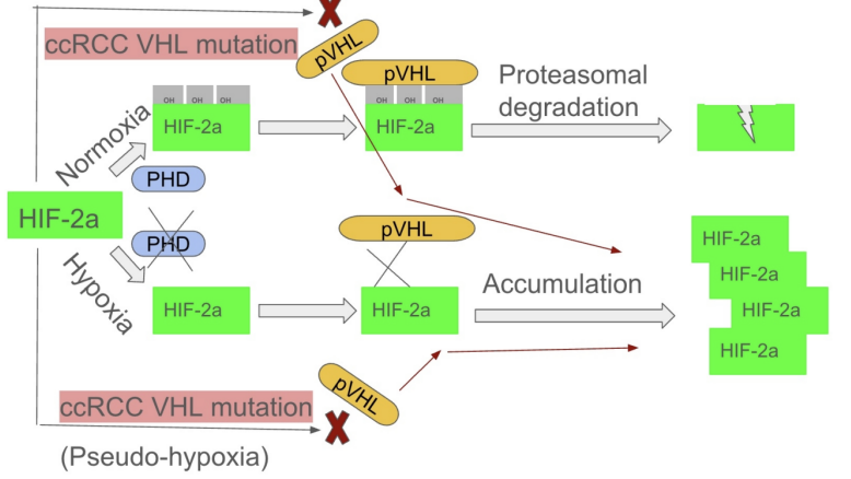 ccRCC primarily originates from the proximal tubular epithelial cell of the nephron. Its tumorigenesis and progression are heavily dependent on a series of genetic and epigenetic alternations, with VHL tumor suppressor gene acting as the central initial event. A specific region of VHL gene encodes pVHL, which is responsible for the degradation of hypoxi-inducible factors (HIF-a subunits). Under normoxic conditions, HIF-a proteins enable identification and tagging with ubiquitin by pVHL, resulting in their subsequent degradation. In contrast, under hypoxia conditions or when VHL is mutated or deleted, HIF-a subunits escape degradation and accumulate in the nucleus and activate transcription of various target genes. Nearly all ccRCC associated VHL mutations disrupt this regulatory mechanism, resulting in dysregulated HIF signalling.