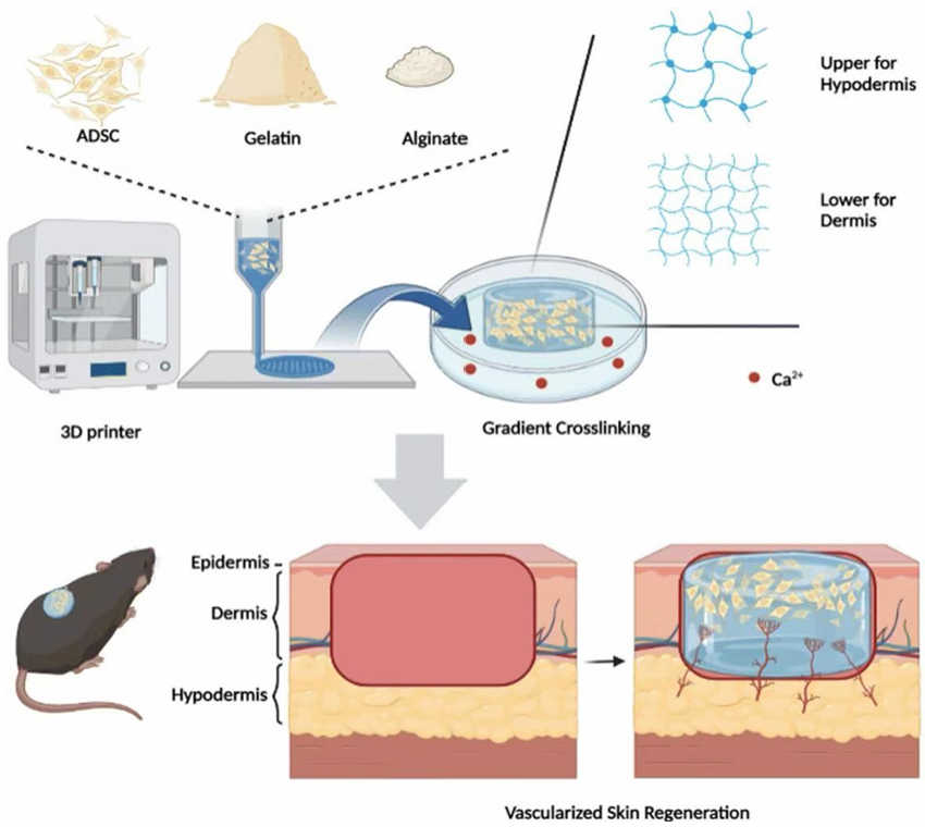 [14]. Y. Ma et al., '3D bioprinting of a gradient stiffened gelatin-alginate hydrogel with adipose-derived stem cells for full-thickness skin regeneration’, J Mater Chem B, vol. 11, no. 13, pp. 2989–3000, Feb. 2023, doi: 10.1039/d2tb02200a.
