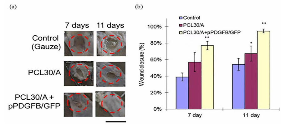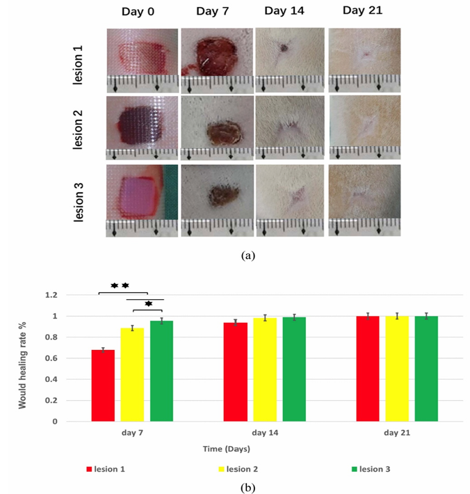 Recombinant collagen, produced via microbial or mammalian expression systems, overcomes many of these issues by ensuring high purity, batch consistency, and eliminating animal-borne pathogens. In vivo studies in rats have shown that 3D bioprinted GelMA/collagen scaffolds accelerate wound closure compared with controls, particularly within the first week (Figure 1) [10]. Quantitative data confirmed significantly higher healing rates (p < 0.05, p < 0.01), with performance attributed to the scaffold’s precisely engineered architecture that directs cell migration and proliferation. Despite these advantages, recombinant collagen remains limited by high production costs, low yields, and difficulty in replicating complex post-translational modifications. Nevertheless, its synergy with 3D bioprinting presents a promising avenue for advanced wound repair applications.