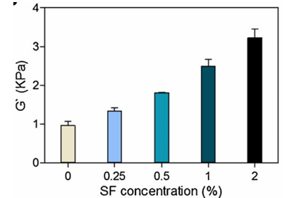 To enhance the mechanical strength of PEG, it can bind to silk fibroin. Silk fibroin (SF) is a natural protein with excellent mechanical properties and biological activity. The mechanical properties of PEG hydrogel can be significantly improved by combining SF with PEG. The SF molecular chain contains a large number of hydrophobic regions, which can form β-sheet crystals under appropriate conditions (such as ultrasound treatment, freezing thawing). These β- folded structures can serve as physical crosslinking points, forming interpenetrating networks (IPNs) with chemical crosslinking networks of PEG (such as photo crosslinking of PEG4A) to enhance overall rigidity. In addition, hydrogen bonds can be formed between the ether bond (- O -) of PEG and the amide bond (- CONH -) of SF, further enhancing the interfacial adhesion between the two phases. This interaction can reduce the slip of PEG chain and improve the elastic modulus of hydrogel. From the experimental results shown in figure 6 below, it can also be seen that the shear modulus increases with the increase of SF concentration, indicating an increase in material stiffness. As a type of skin material, it is more durable.