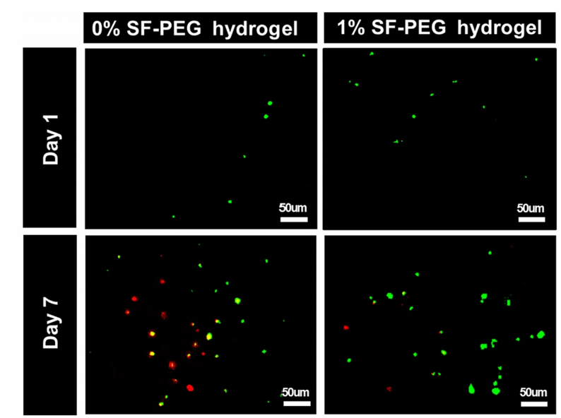Meanwhile, silk fibroin (SF) contains a natural protein RGD(Arg Gly Asp, arginine glycine aspartic acid) sequence that can promote cell adhesion through integrin receptors on the cell surface, avoiding cell separation or death due to the lack of attachment points on smooth PEG surfaces. RGD sequence is a short peptide sequence widely present in extracellular matrix (ECM) proteins such as fibronectin, fibronectin, collagen, etc. It is the main recognition site of integrin receptors, directly mediating the adhesion of cells to ECM or biomaterials. After being recognized by integrin receptors on the cell membrane, RGD sequences trigger intracellular signaling pathways to regulate cell behavior, such as adhesion, spreading, survival, and proliferation [17]. Introducing RGD into PEG can simulate the microenvironment of natural ECM and enhance cell viability. The following figure 7 shows the relationship between cell survival rate and SF addition amount [16]. It can be observed that the number of cells significantly increased after the addition of silk fibroin protein. The addition of SF improved the cell survival environment and increased the cell survival rate.