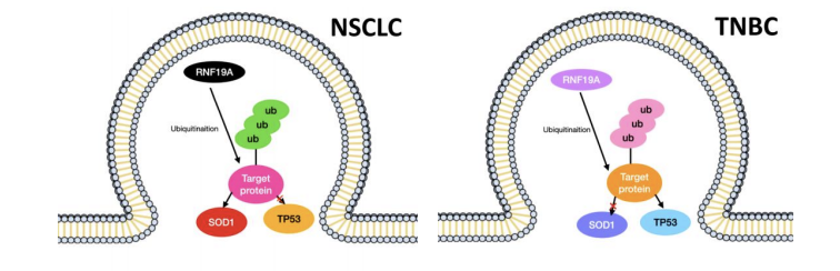 This study demonstrates that the subcellular localization of E3 ligase RNF19A and its potential substrates is highly dynamic, responding significantly to various experimental treatments. Through immunofluorescence staining, distinct localization patterns emerged, highlighting RNF19A's intricate regulatory roles in cellular processes. The findings in this study underscore the significance of RNF19A in modulating substrate function and intracellular positioning, which could be crucial for understanding its contributions to pathological conditions like cancer. Findings reveal specific implications for the RNF19A-SOD1 pathway in NSCLC. And interaction between RNF19A and TP53, further research is needed to investigate their relationship with the occurrence of breast tumors. These insights serve as a foundational basis for future research focused on exploring RNF19A as a potential therapeutic target, especially in diseases characterized by protein localization and function.