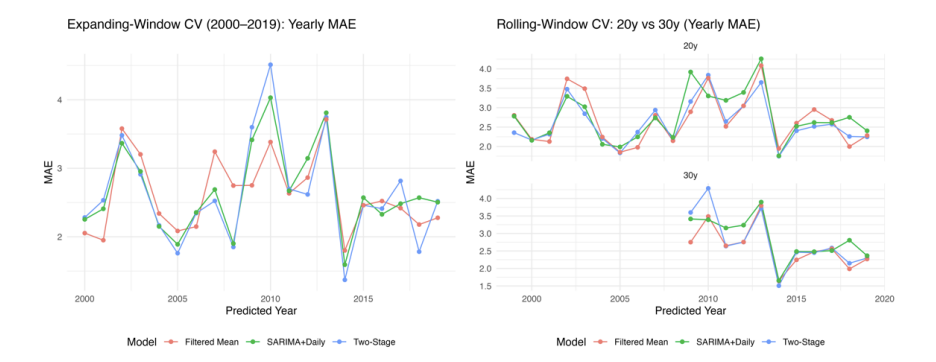As shown in Figure 2, this research compared expanding-window CV enlarged training data yearly from 2000 and rolling-window CV with fixed sample sizes of 20 and 30 years for the top three best-performing models. Despite similar overall performance across the three approaches, the Two-Stage Regression and Filtered Mean method outperformed the SARIMA+Typical Day reconstruction model. The fluctuation of MAE is evident in all three subplots for 2010, as the winter of 2009-2010 experienced a climatic anomaly known as the "Big Freeze" [14]. This suggests the models have both strengths and weaknesses.