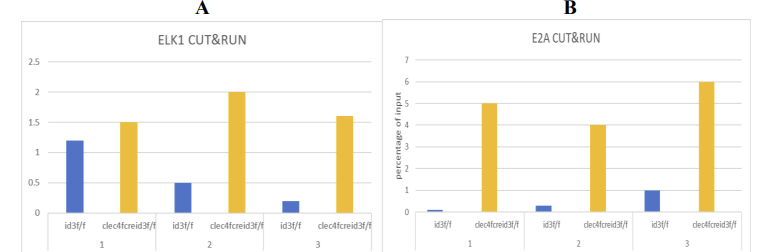 In the Id3f/f sibling group, due to the disruption of the ID3-E2A/ELK1 complex. A reduction or complete loss of E2A/ELK1 binding at the TBK1 promoter was observed. (see Fig.3)