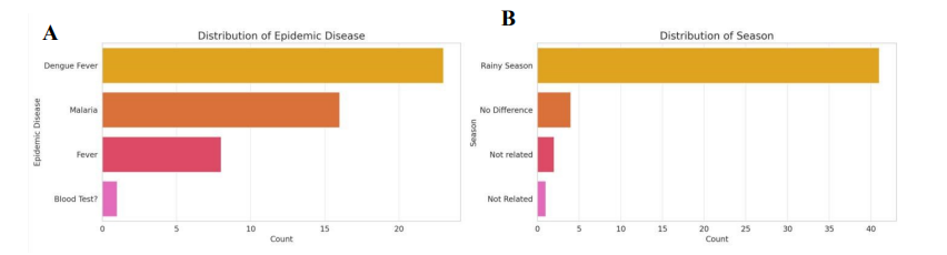 Frontline providers emphasized mosquito-borne illnesses as the dominant clinical challenge. According to provider reports, dengue fever and malaria were the most common epidemic diseases, far outnumbering nonspecific fever cases (Figure 2A). Nearly all healthcare workers linked case surges to the rainy season, with minimal reports of cases being unaffected by seasonal patterns (Figure 2B).