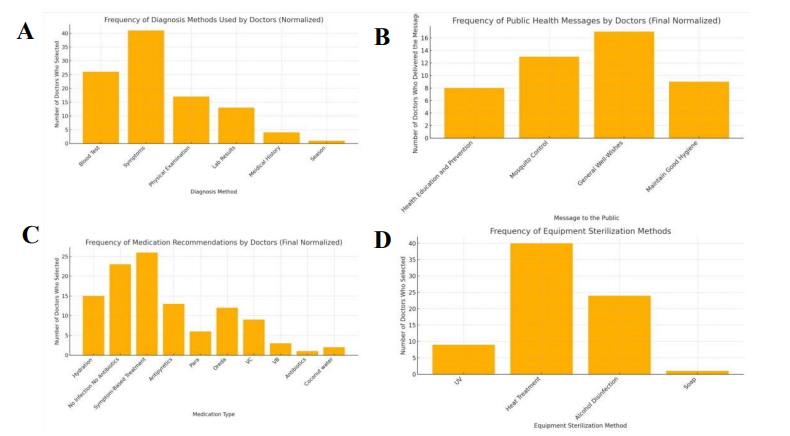Treatment recommendations were dominated by hydration, symptomatic management, and antipyretics, with antibiotics prescribed far less frequently (Figure 3A). This reflects both cautious prescribing practices and limited drug availability. Beyond treatment, doctors also engaged in public health messaging, most commonly delivering general well-wishes, mosquito control advice, and hygiene reminders, while structured health education campaigns were less consistently emphasized (Figure 3B).