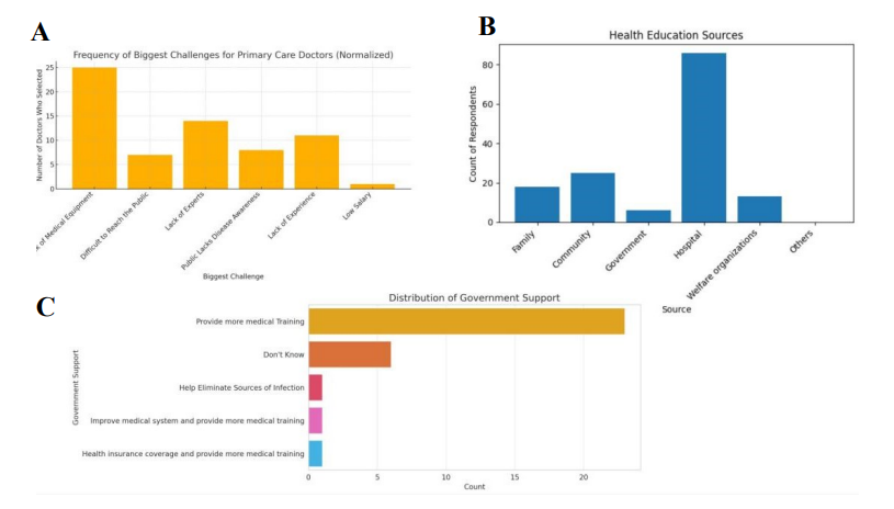 Community health education was reported as highly centralized. Hospitals were overwhelmingly identified as the main source of health messaging, with limited input from community, family, or government sources (Figure 4B). Providers also expressed a strong desire for expanded training opportunities; most requested additional medical training as the most urgent form of government support, while only a minority mentioned broader systemic reforms or infection-source elimination (Figure 4C).