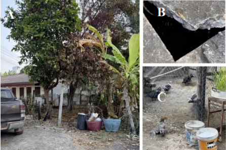 (A) Stagnant household water containers placed outside homes. (B) Open drainage with unclear separation of clean and contaminated water. (C) Livestock kept adjacent to dwellings, increasing exposure to vectors.