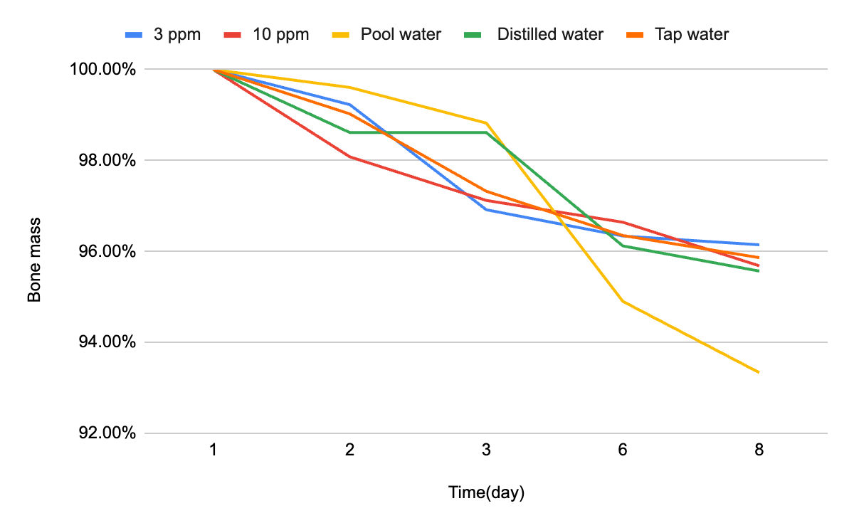 This study investigates the effect of pool water chemistry on tooth enamel. Enamel, primarily composed of hydroxyapatite, is highly durable yet vulnerable to erosion in acidic or chemically imbalanced environments. Among environmental exposures, swimming pool water presents a potential risk due to chlorine-based disinfectants, such as sodium hypochlorite, which can alter water pH and accelerate calcium loss. To model enamel exposure, chicken thigh bones were used as analogs because of their high hydroxyapatite content. Bones were immersed in different water conditions: distilled water (control), tap water, water from Gilmour Academy’s pool, and chlorine solutions at 3 ppm and 10 ppm to simulate varying pool environments. Over a 48-hour period, mass changes were recorded to assess calcium loss. Results showed that pool water caused the greatest mass loss (6.67%), while the 3 ppm chlorine solution caused the least (3.85%). The findings suggest that pH plays a more significant role in mineral dissolution than chlorine concentration alone. These results highlight the importance of maintaining balanced pool water chemistry, particularly pH control, to minimize potential enamel erosion and protect dental health.